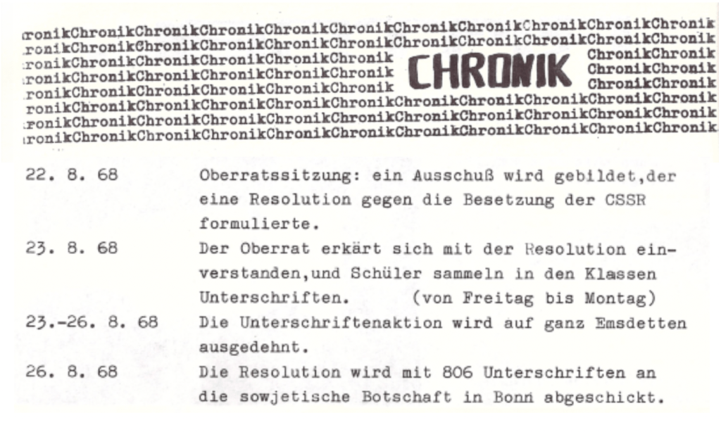 Der Prager Frühling war eine Reformbewegung in der Tschechoslowakei im Jahr 1968, angeführt von Alexander Dubček, die einen „Sozialismus mit menschlichem Antlitz“ anstrebte. Ziel war es, Meinungsfreiheit, Pressefreiheit und politische Mitbestimmung zu stärken, ohne den sozialistischen Charakter des Staates vollständig aufzugeben. Die Bewegung wurde im August 1968 durch den Einmarsch von Truppen des Warschauer Pakts gewaltsam beendet. Dieses Thema bewegte auch die Schülerinnen und Schüler unserer Schule, in der Schülerzeitung aus dem Jahr ist zu lesen: