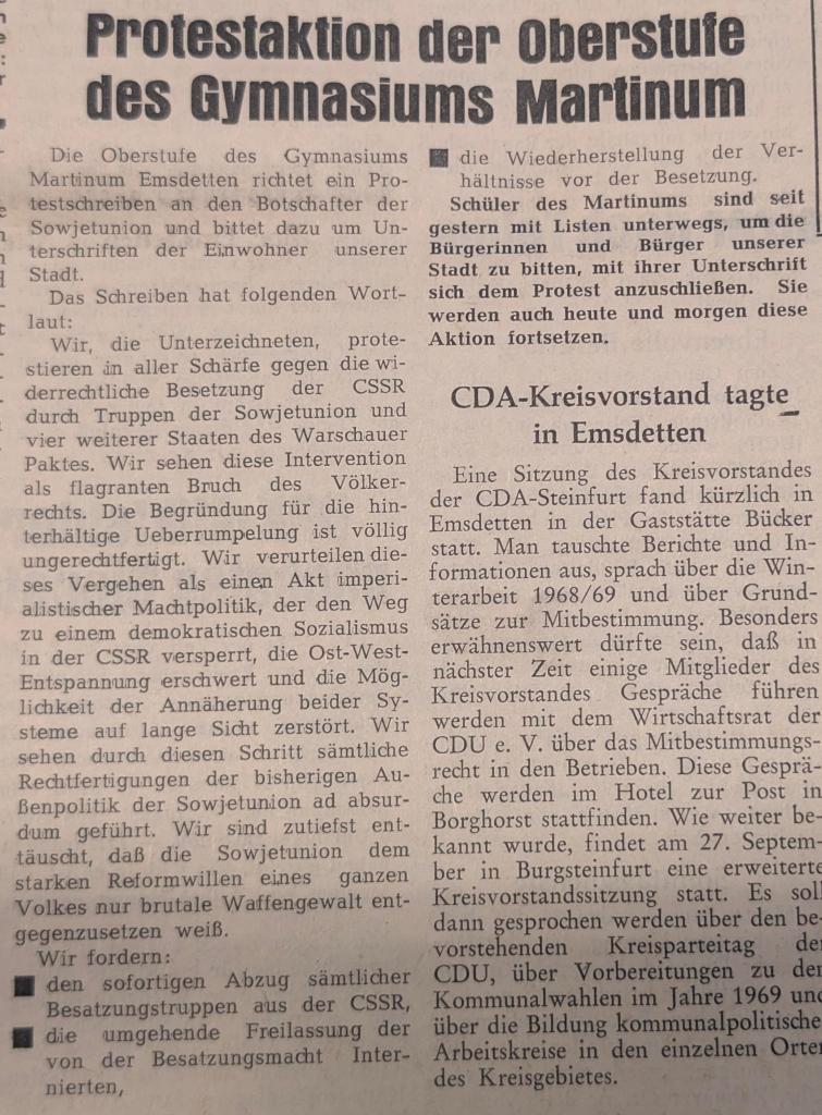 Mit den Angaben der Schülerzeitung aus dem Schularchiv recherchierten wir weiter und besuchten mit unserer Klasse am 03. November das Stadtarchiv in Emsdetten, um die Emsdettener Volkszeitung einzusehen. Wir wurden fündig in der Ausgabe vom 24. August 1968: