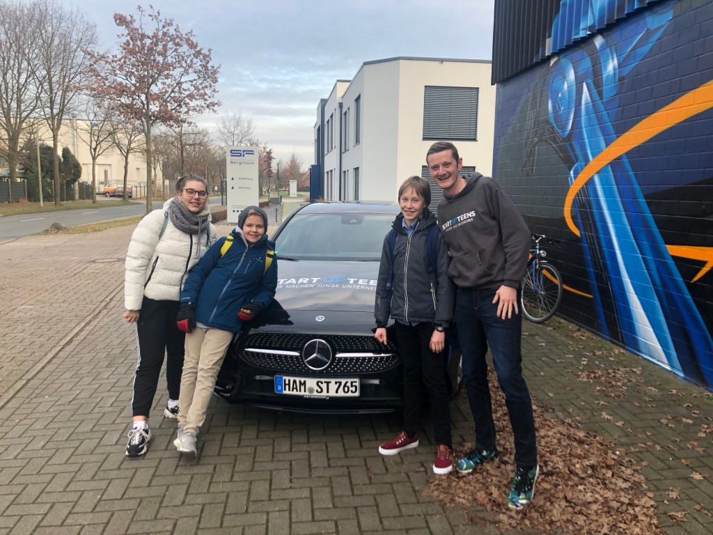 Auf dem Foto sind die drei Schülerinnen und Schüler und Jochen Heimann, Leiter des STARTUP TEENS Regionalbüros für Nordrhein-Westfalen, zu sehen. Einen Bericht zum Tag finden Sie HIER oder weitere Fotos auf Facebook.