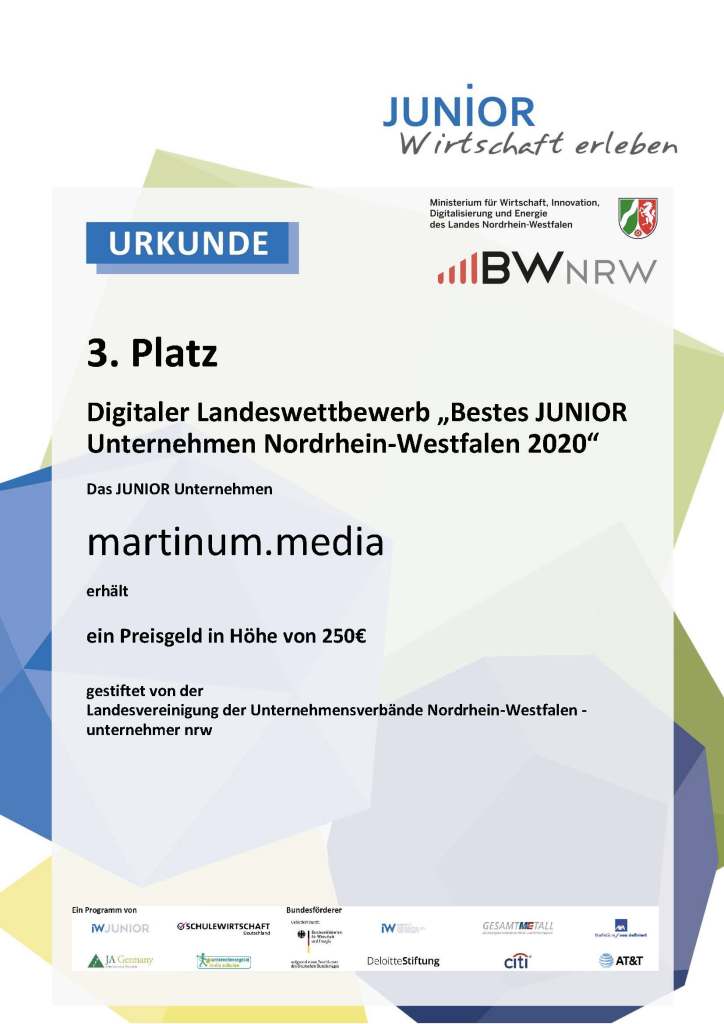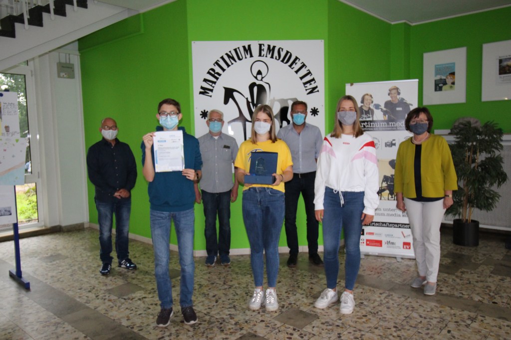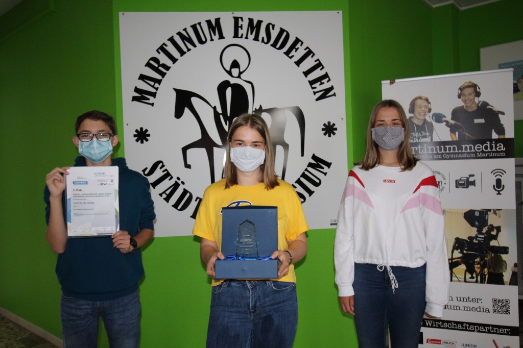 Die Schülerfirma martinum.media des Gymnasium Martinum hat den dritten Platz des JUNIOR-Landeswettbewerbs gewonnen. Stellvertretend für die gesamte Schülerfirma nahm die dreiköpfige Geschäftsführung Lina Kloppenborg, Merit Kloppenborg und Kaya Pieper den Pokal und die Urkunde am Freitag von Schulleiterin Anne Jürgens entgegen. Die Landesvereinigung der Unternehmensverbände in Nordrhein-Westfalen e.V. stiftete ein Preisgeld von 250 Euro.